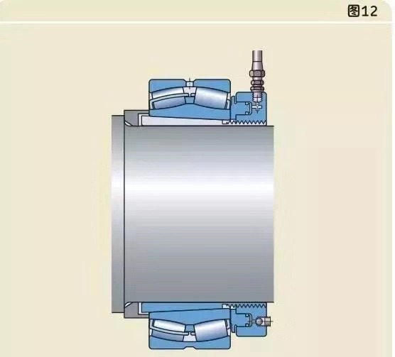 注油法的工作原理是:液壓油在高壓下通過(guò)油孔和油槽,注入軸承和軸徑之間的配合面,形成一層油膜。油膜將配合面分開,使得配合面之間的摩擦大幅減少。這種方法通常用于直接把軸承安裝在圓錐形軸徑上的情況。必須的油孔和油槽應(yīng)是整體軸設(shè)計(jì)的一部分。如果緊定套和退卸套,已加工有油孔油槽,這種方法也可用于將軸承安裝在緊定套或退卸套上。